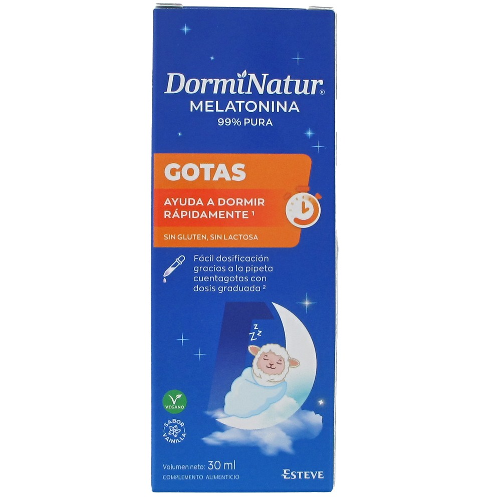DormiNatur Melatonina 99% Pura en Gotas 30 ml es un complemento alimenticio formulado a base de melatonina de alta pureza que contribuye a reducir el tiempo necesario para conciliar el sueño. Está especialmente indicado para personas con dificultad para dormirse, alteraciones del ritmo circadiano o situaciones de desajuste horario como el jet lag.