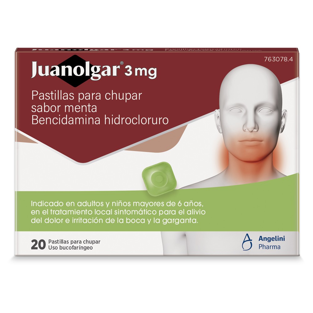 Juanolgar 3 mg Sabor Menta 20 Pastillas para Chupar es un medicamento antiinflamatorio de uso bucofaríngeo que contiene bencidamina hidrocloruro como principio activo. Está indicado en adultos y niños mayores de 6 años para el tratamiento local sintomático del dolor e irritación de la boca y la garganta, especialmente en procesos inflamatorios leves sin fiebre.