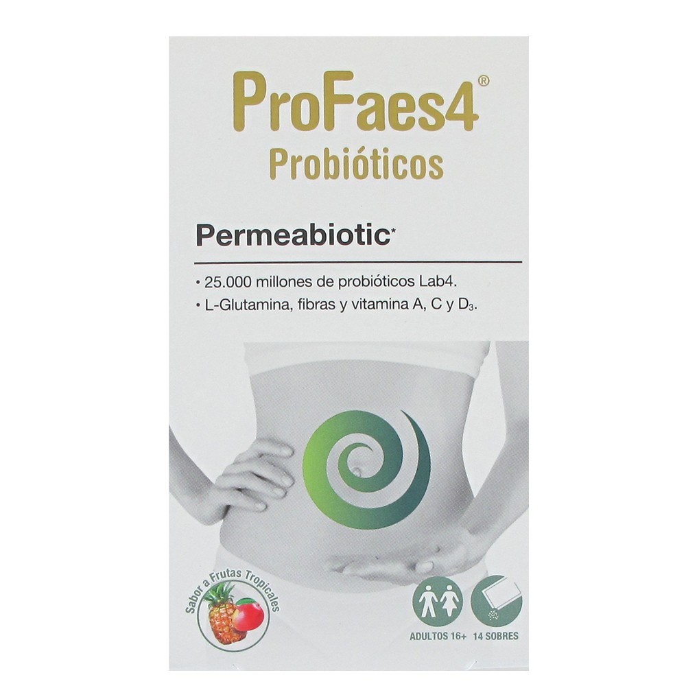 ProFaes4 Probiotico Permeabiotic 25.000 millones de probioticos Lab4 y l-glutamina fibras y vitaminas A, C Y D3 14 Sobres Sabor Fruta Tropical es un complemento alimenticio en sobres con agradable sabor a fruta tropical, formulado para el cuidado integral del sistema digestivo. Combina 25.000 millones de probióticos del complejo Lab4 con L-glutamina, fibras prebióticas y vitaminas A, C, D3 y del grupo B, contribuyendo al equilibrio de la microbiota intestinal y al mantenimiento de la salud intestinal e inmunitaria.